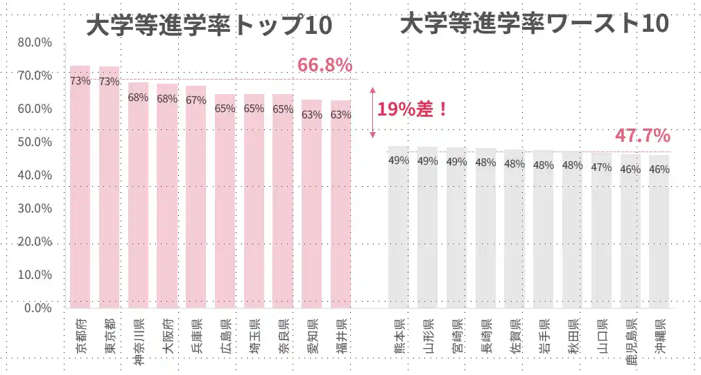 近年、日本では地域による大学進学率の差が拡大しています。「文部科学省令和5年度学校基本調査」によると、都市部と地方では進学率に約19%の差が存在し、「どこに生まれたか」によって進路の選択肢が大きく制限されている現状があります。 |