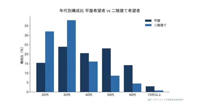 | 第一に、年代別では40代後半から本格化する選択肢となっている。子育てを終えた、あるいは終えつつある世代が「次の住まい」として平屋を選ぶ動きが、データ上明確に観測できる。 | ||||||||||||||||||