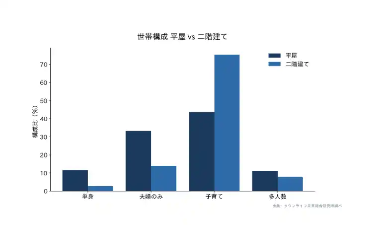 3. 平屋希望者の45.0%が「夫婦のみ・単身」世帯 ─ 子育て世帯中心の二階建てと対照的 |