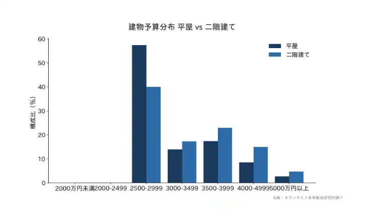 | 平屋希望者の建物予算分布をみると、2500-2999万円帯が57.4%と過半数を占めた。二階建て希望者の同帯は40.0%であり、平屋検討者は明確に低い予算帯に集中している。 | ||||||||||||||||||