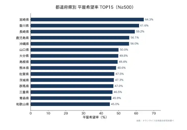 | 都道府県別に平屋希望率を集計したところ(サンプル数500件以上の県のみ)、宮崎県64.3%、香川県61.6%、長崎県59.2%、鹿児島県56.1%、沖縄県56.0%と西日本・特に九州沖縄エリアで過半数を超えた。一方、東京都は16.5%、大阪府17.9%、京都府20.0%、神奈川県20.9%と三大都市圏では20%前後に留まり、地域による志向の差は最大4倍弱に達している。 | ||||||||||||||||||