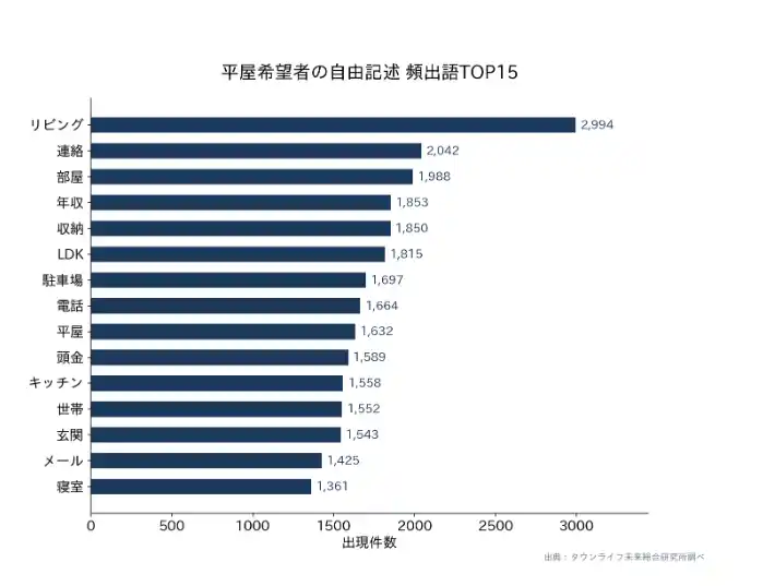 6. 平屋希望者の自由記述 ─ 「リビング」「収納」「駐車場」「寝室」が頻出 平屋希望者の自由記述欄を形態素解析し、頻出語を抽出したところ、TOP15は「リビング」「連絡」「部屋」「年収」「収納」「LDK」「駐車場」「電話」「平屋」「頭金」「キッチン」「世帯」「玄関」「メール」「寝室」となった(重複文を除外した有効データを対象)。「ロフト」「中庭」「書斎」といった付加価値設備よりも、「リビング」「収納」「駐車場」「寝室」といった基本機能の充実への言及が目立つ。 |