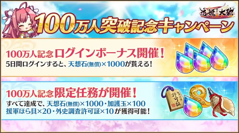 ■最大2,000個の「天想石」をプレゼント!「100万人突破記念キャンペーン」開催! |