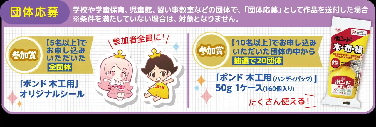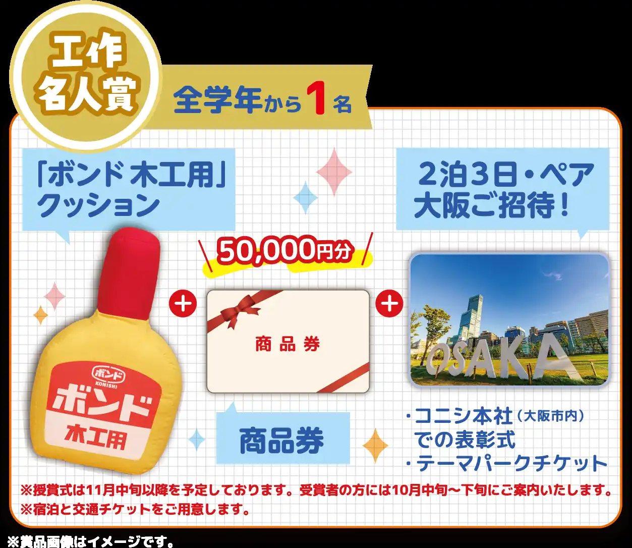 | 今年21回目の開催となる本コンテストは、コニシ株式会社設立100周年を記念して「♪ピッカピカの一年生」のCMソングで知られる創刊100周年の「小学一年生」(小学館)とのコラボを実施。 スペシャルバージョンとして、(1)「工作名人賞」(全学年から1名)、(2)「コニシ賞」(各学年1名、合計6名)、(3)「コニシ」×「小学一年生」100年トモダチ賞(各学年1名、合計6名)、(4)「入賞」(全学年、合計100名)を選定し、(1)~(3)の受賞作品と作者のニックネームを、2025年12月26日発売の「小学一年生」2・3月号の誌面にて紹介いたします。さらに、100周年記念にふさわしく賞品も豪華にパワーアップ!「工作名人賞」の受賞者には、2泊3日・ペアで大阪へご招待※、コニシ本社(大阪市内)にお招きして表彰状の授与式を行うほか、テーマーパークのチケットや、5万円分の商品券、「ボンド 木工用」オリジナルクッションを贈呈いたします。 | |||||||||||||||||