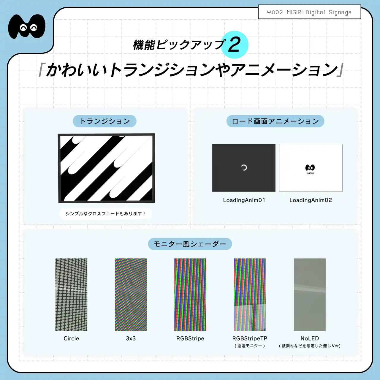 1)Image Loadingを活用したデジタルサイネージ 2)様々なシーンを想定したデジタルサイネージと五種類スタンドが同梱 3)プレイヤーとの距離や表示順等による優先順判定ロード 4)VRAM節約の機構(指定容量を超えた際の不要な画像のリリース) 5)かわいいトランジションやロード画面アニメーション 6)専用のモニター風シェーダー 7)ImageLoadingだけでなく、組み込み画像の表示にも対応 8)余白モード設定や動作確認モードなど、細かく丁寧な作り 9)Quest/iOS/Androidにも対応 |