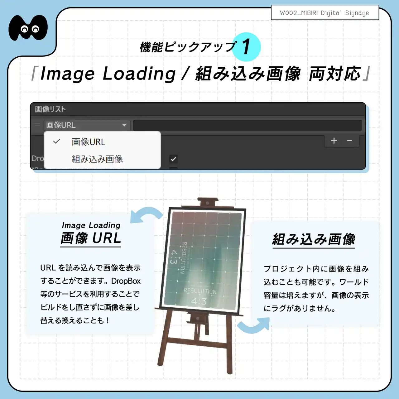 | 「MIGIRI Digital Signage」はImage Loadingと組み込み画像に対応したデジタルサイネージです。VRChatのワールド制作での使用を想定しています。 | ||||||||||
