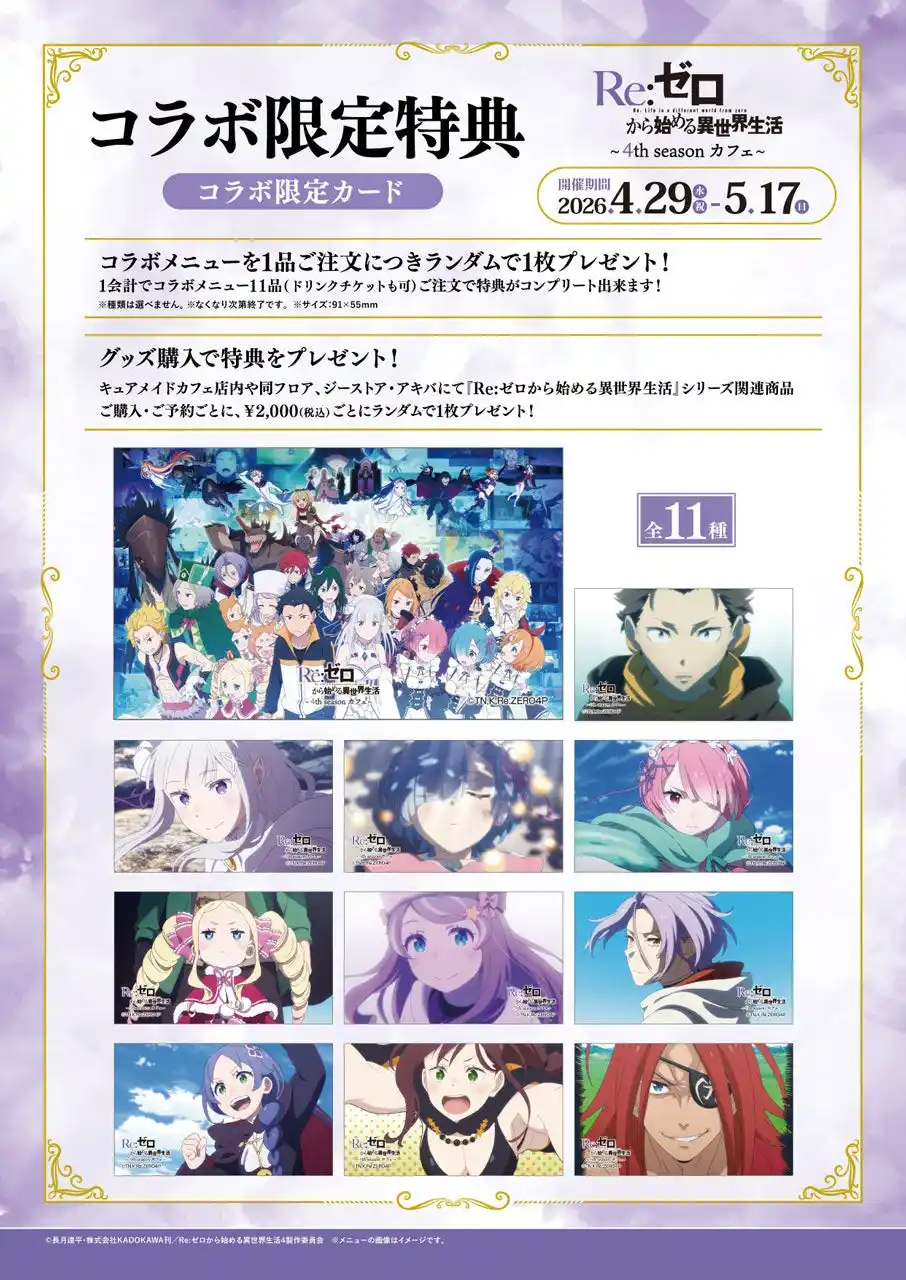 TVアニメ放送10周年を迎え、「4th season」が2026年4月8日より放送となる『Re:ゼロから始める異世界生活』のコラボカフェがキュアメイドカフェ(CURE MAID CAFE)にて開催いたします。 |