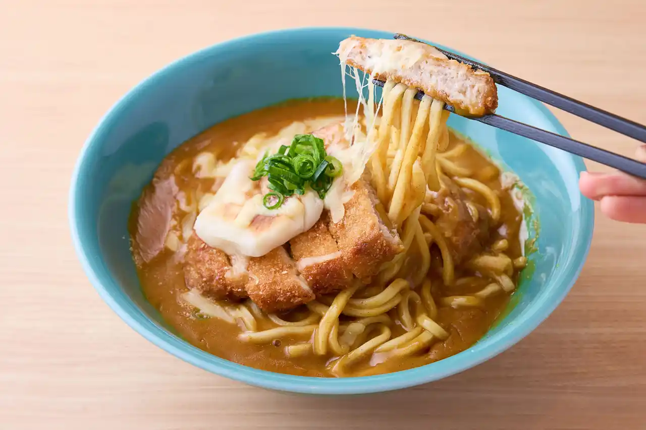 とんかつのっけカレーうどん ¥1,900(セット価格)※写真はおすすめトッピング入り:焼きもち+¥300、チーズ+¥300 |