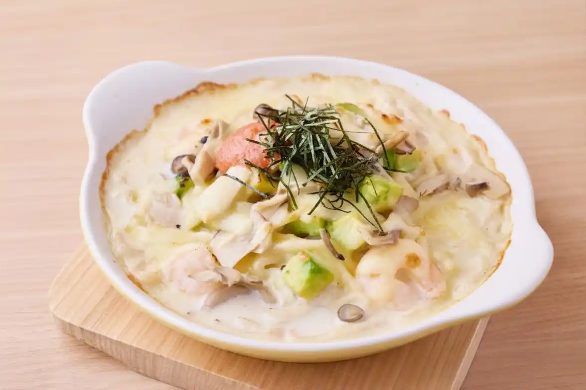 アボカドと小海老のグラタンうどん ¥2,050 (えらべるおやつ+ドリンクビュッフェのセット価格) ※写真はおすすめトッピング入り:明太子+¥330、きのこ+300円 |