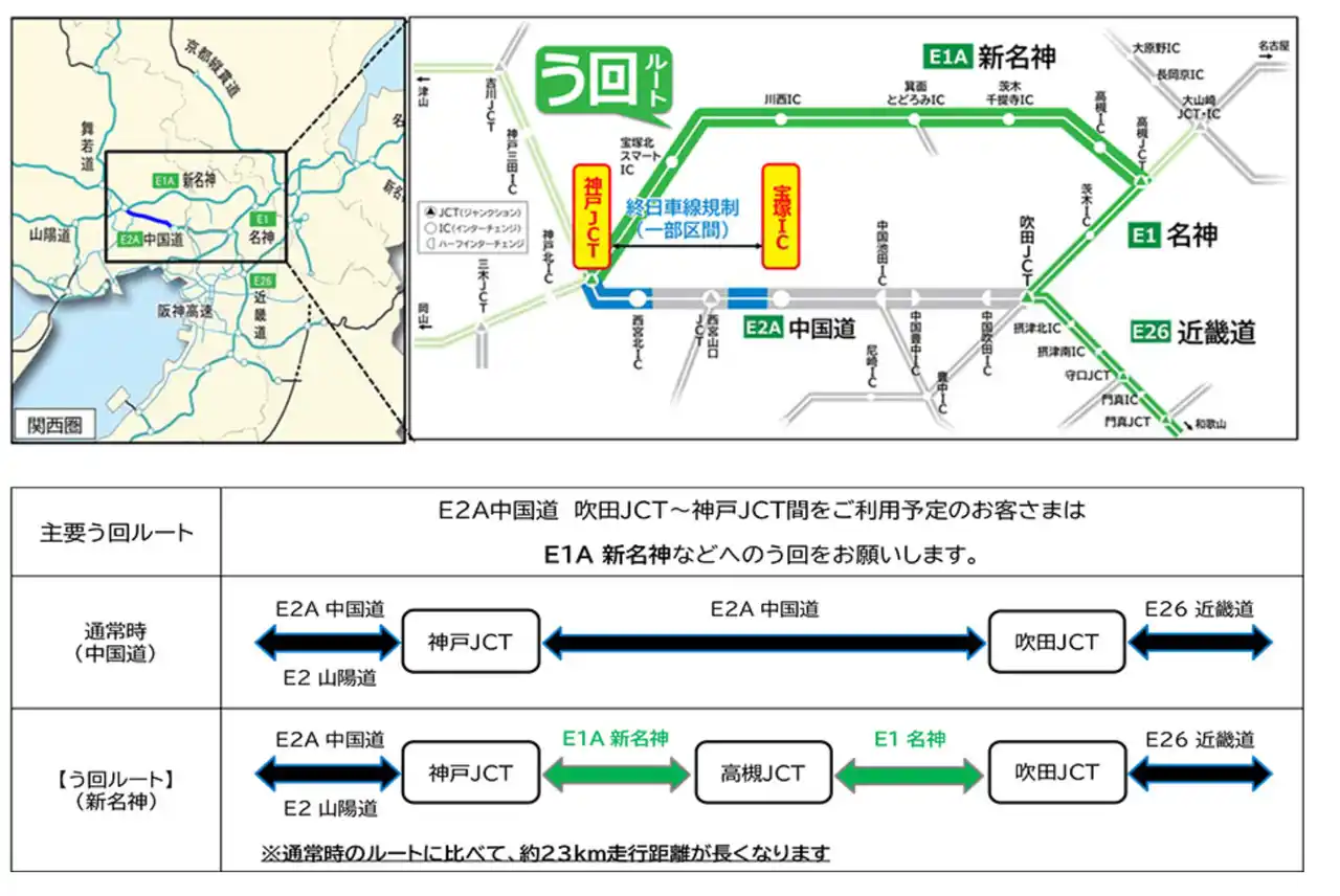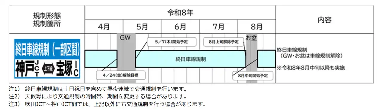 本件は、令和7年12月5日の「E2A 中国自動車道(吹田JCT~神戸JCT)のリニューアル工事 令和8年1月からの交通規制の日程」でお知らせすることとしていた内容です。 |