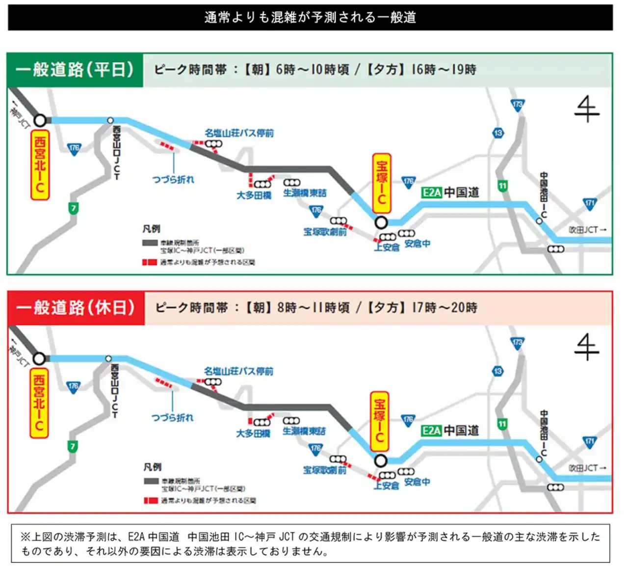 交通規制区間周辺の高速道路および一般道では、時間帯により通常よりも大きな渋滞の発生が予測され、所要時間が多くかかることが見込まれます。事前に最新の交通情報をご確認のうえ、時間に余裕をもってお出かけください。またE1A新名神などへのう回やご利用時間の変更などにご協力ください。 |