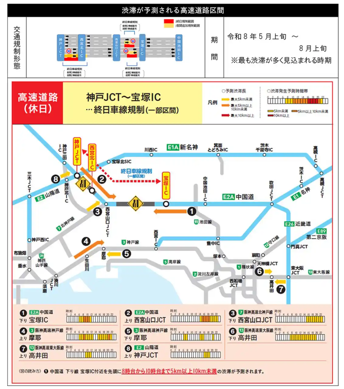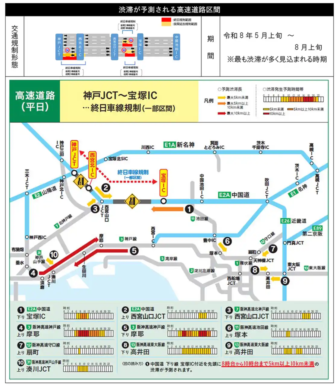 宝塚(たからづか)インターチェンジ(IC)~神戸JCT間では一部の区間で終日車線規制を行います。朝夕を中心に渋滞が予測されておりますので、E1A新名神高速道路(E1A新名神)等へう回いただきますようお願いいたします。 |