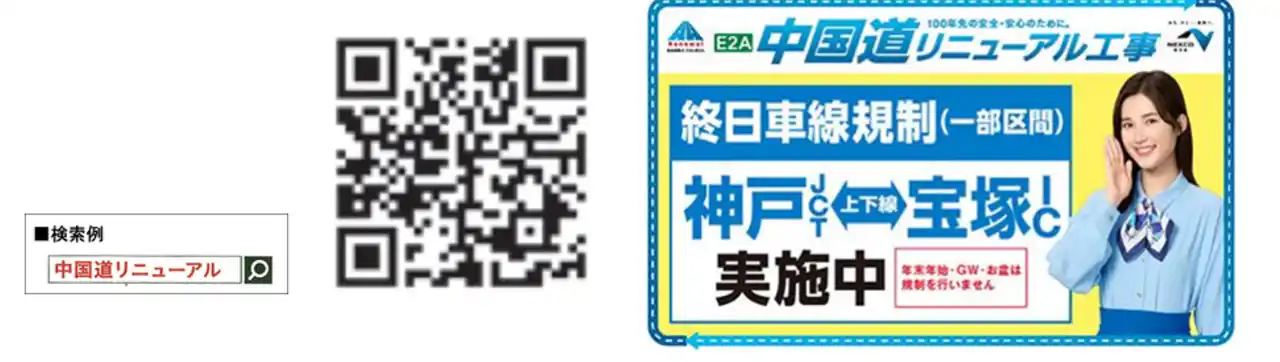 「中国道リニューアル工事専用WEBサイト」において、渋滞予測やう回ルート、リアルタイムの所要時間、工事内容、工事の進捗などを提供してまいりますので、お出かけの際は、最新情報をご確認の上、E1A新名神などへのう回やご利用時間の変更などにご協力ください。 |