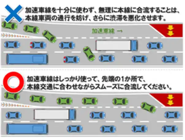 混雑時の合流部では加速車線を十分に活用し、先端の1か所で合流するファスナー合流へのご協力をお願いします。
