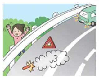 停車後は、ハザードランプを点灯するとともに発炎筒や停止表示板で後続車に、事故車や故障車の存在を知らせてください。道路上に留まらずに、通行車両に注意しながら速やかに“ガードレールの外”など安全な場所に避難してください。「110番」または「道路緊急ダイヤル#9910」もしくは「非常電話」にて通報してください。 |