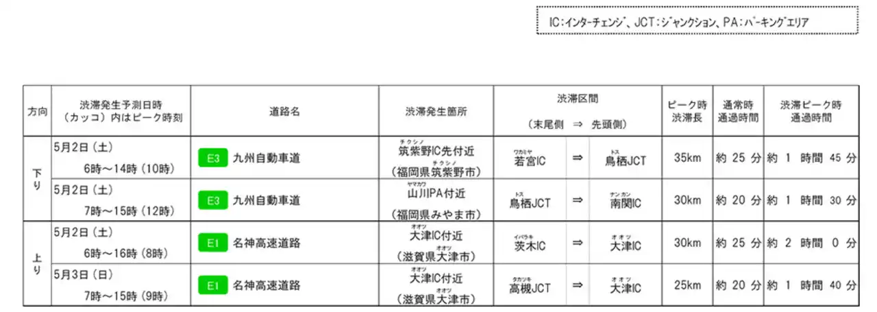 NEXCO西日本(大阪市北区、代表取締役社長:芝村善治)は、ゴールデンウィーク期間〔令和8年4月25日(土曜)~令和8年5月6日(水曜)の12日間〕の管内の高速道路における交通集中による10km以上の渋滞予測をとりまとめました。高速道路をご利用されるお客さまには、渋滞が多く予測される日や時間帯を前後にずらすなど渋滞を避けたご利用をお願いします。 |