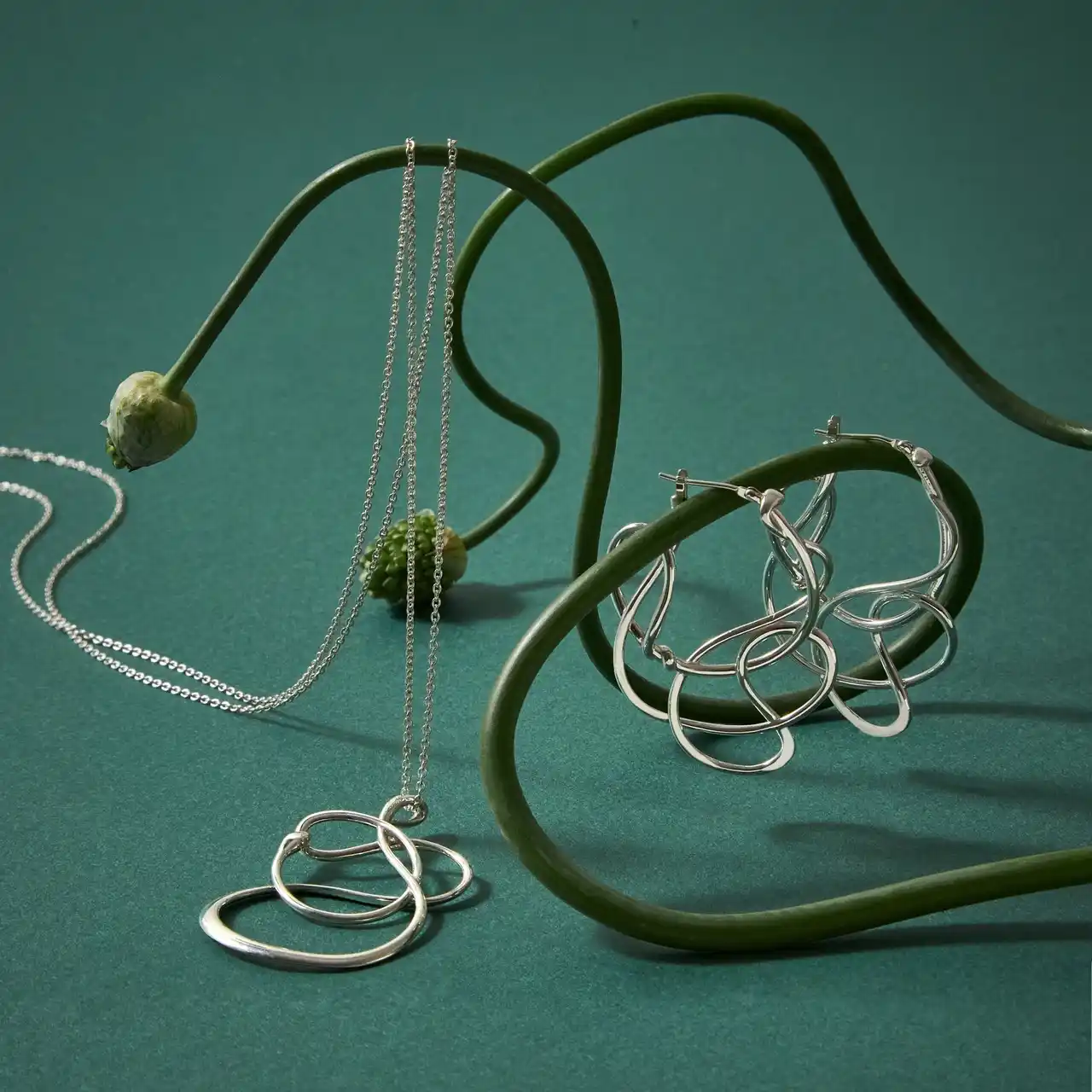 その曲線美に、古来より繁栄と永遠の象徴とされてきた蔦の生命力を重ね、モダンに描き出したネックレスとピアス。 |
