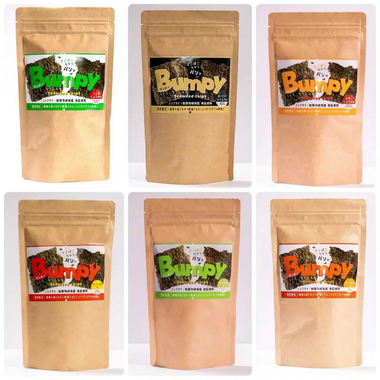 Bumpyは、ノンフライでありながらポテトチップスのようなパリッとした食感を実現した海苔スナックです。 |