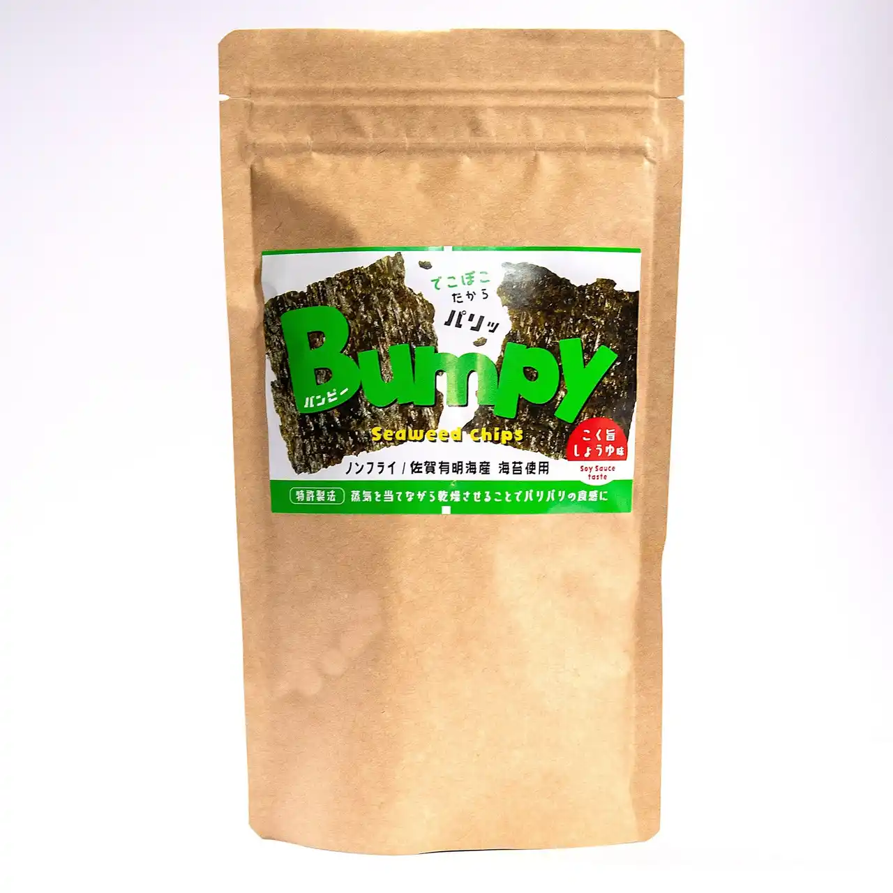 Bumpyは、従来は加工が難しく廃棄されることもあった「色落ち海苔」を活用し、特許登録済みの「スチームドライ製法」によって製造しています。 |