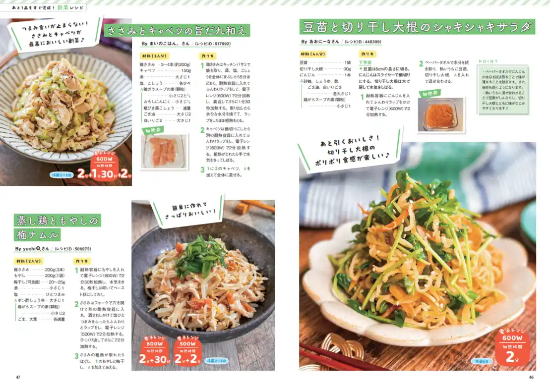「もう一品足したいな」というときに役立つ、手軽に作れる副菜パートです。電子レンジで数分加熱するだけの時短メニューや、切って和えるだけで完成するスピード副菜など、忙しい日でも苦にならない手軽さが魅力です。素材のうま味を引き出す味付けで、お弁当の隙間埋めや、お酒のお供としても重宝する便利なラインナップが揃っています。 |