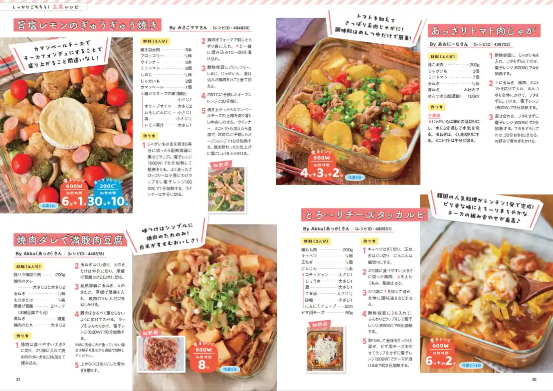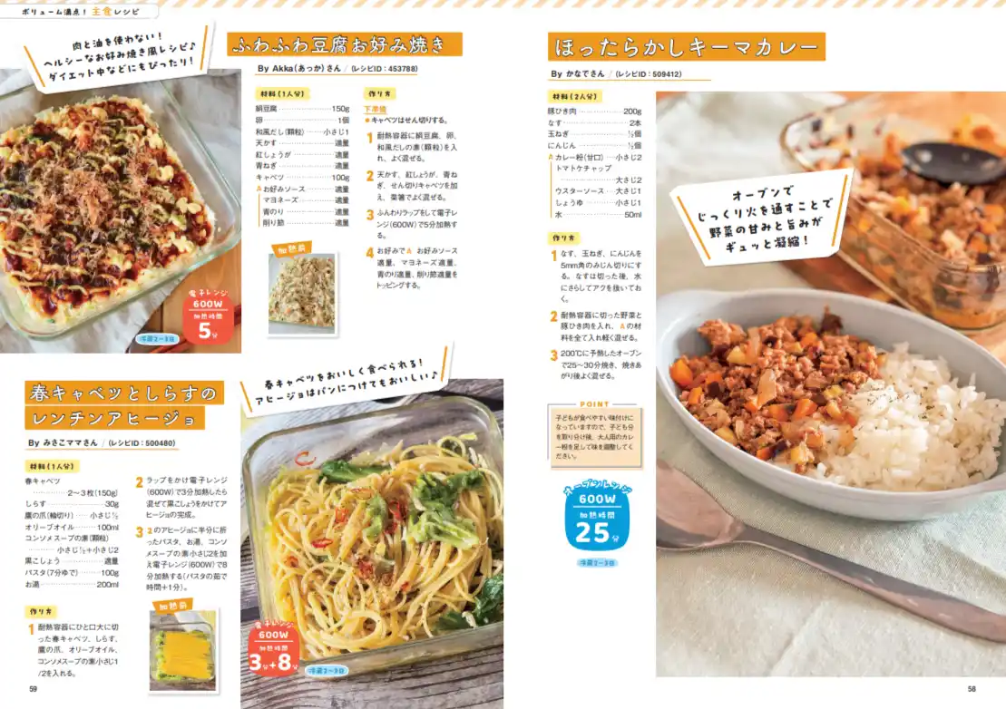 掲載されているレシピは、食卓の主役になるボリューム満点の主菜から、あと一品ほしい時に助かる副菜、ひと皿で大満足の主食、そして本格的なおやつまで、バラエティ豊かに揃っています。さらに、電子レンジで効率よく火を通した後に、トースターやオーブンで仕上げの焦げ目をつけるといった「二段加熱」も思いのまま。容器ひとつで作ったとは思えないほど香ばしくジューシーな仕上がりに、家族みんながきっと驚くはずです。 |