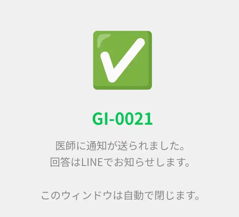 「医師に通知が送られました。回答はLINEでお知らせします。」 |