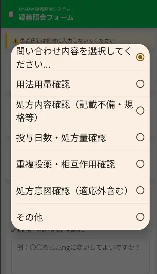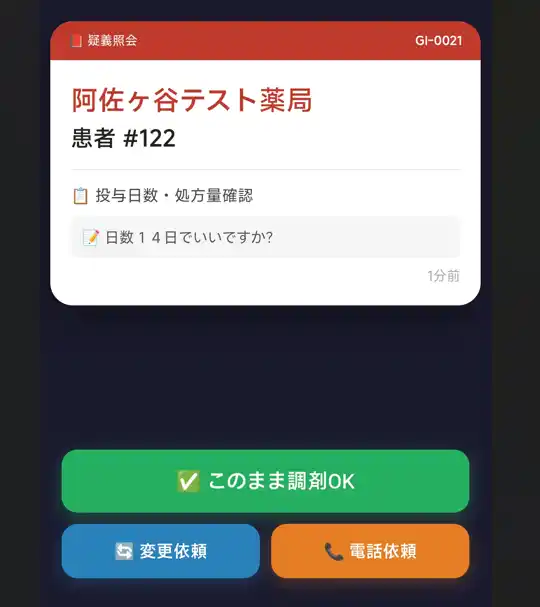 薬剤師がLINEのメニューから「疑義照会」をタップすると、このフォームが開く。用法用量・投与日数・重複投薬・処方意図など、よくある照会パターンを選択肢として用意。患者氏名は入力しない設計で、個人情報はシステムに残らない。電話をかける前に、まずこのフォームを20秒で送れる。 |