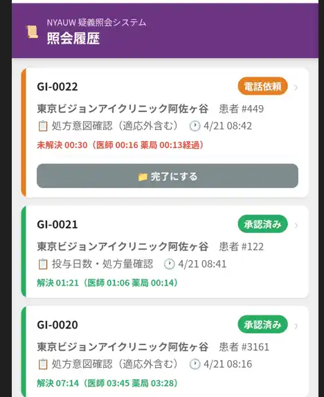 薬局側の履歴画面。赤は未解決、緑は解決済みを示し、それぞれ「医師が何分で回答したか」「薬局が何分で確認したか」「トータル何分かかったか」が秒単位で記録される。チームの対応速度が数字で見える。この数字が、現場の意識を少しずつ変えていく。 |