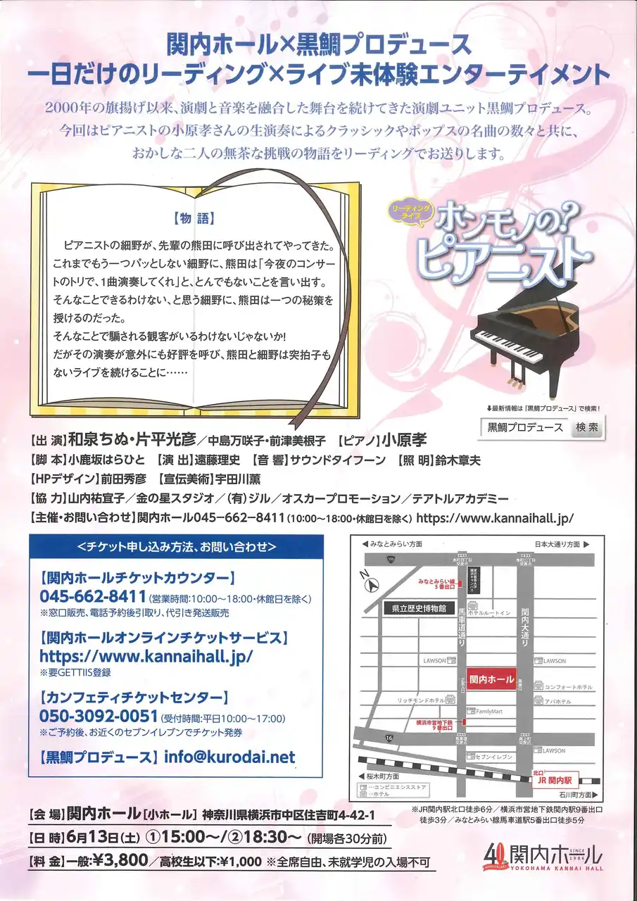 今回はピアニストの小原孝さんの生演奏によるクラシックやポップスの名曲の数々と共に、おかしな二人の無茶な挑戦の物語をリーディングでお送りします。 |