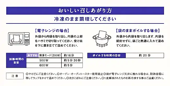 解凍後、電子レンジで温めるだけで、専門店の味をそのままご家庭でお楽しみいただけます。 |
