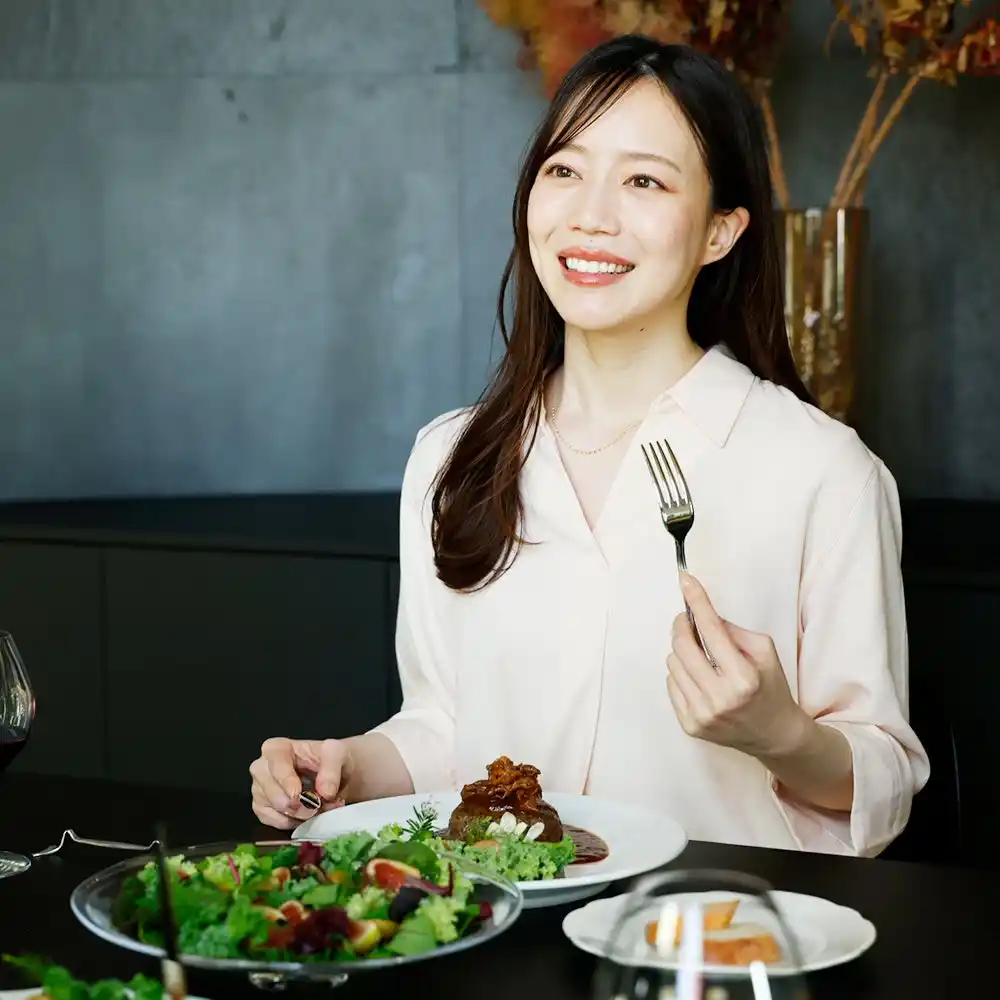 旨味あふれる近江牛100%のハンバーグに近江牛スライスを贅沢に重ね、芳醇デミグラスで仕立てた一皿。 |