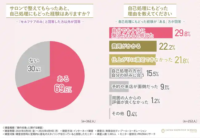 専門店で眉毛スタイリングを受けた方の約7割が、その後自己処理に戻っている実態も示され、「自分でも整えられる」「費用」「仕上がりへの不満」がその理由として挙げられています。このことから、専門店にはセルフケアを超える価値ある技術の提供が必要であることがわかります。 |