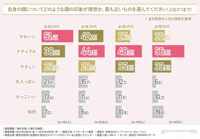 一方で『ナチュラル』な印象は、20代で38.0%だったのに対し、50代では56.9%と大幅に上昇しており、年齢とともに自然体で無理のない印象を重視する価値観が強まっていることが読み取れます。また、『やさしい』印象は全年代で一定数の支持を集めており、他者との関係性や安心感を意識した印象づくりのニーズが安定して存在していると考えられます。 |