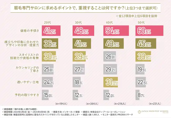 すべての世代で共通して上位に挙がったのは『価格の手頃さ』と『顔立ちや印象に合わせたデザインの分析・提案力』でした。コストと自分に似合うスタイルの提案、この2点が眉毛サロン選びで特に重視されているようです。 |
