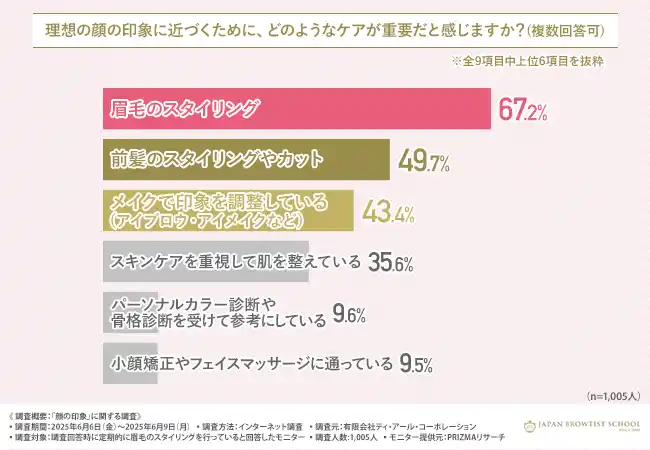 「理想の顔の印象に近づくために重要だと感じるケア」について尋ねたところ、『眉毛のスタイリング(67.2%)』が最も多く、『前髪のスタイリングやカット(49.7%)』『メイクで印象を調整している(アイブロウ・アイメイクなど)(43.4%)』と続きました。 |