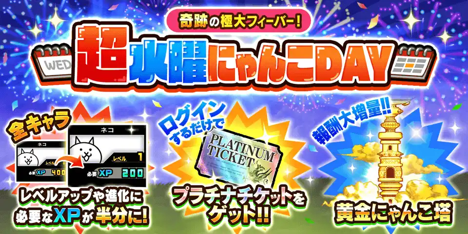 | ポノス株式会社(本社:京都府京都市、代表取締役:辻子依旦、以下「ポノス」)が提供するスマートフォン向けゲームアプリ『にゃんこ大戦争』が、期間限定イベント「超水曜にゃんこDAY」を、2026年4月22日(水)0:00より開始いたしました。 | ||||||||||||||||