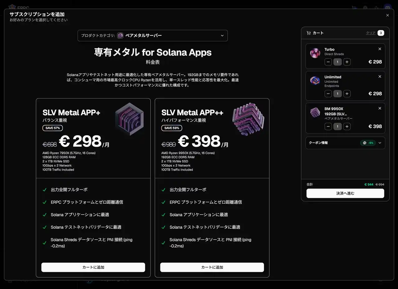今回のリリースで追加されたもう一つの主要な改善が、カートによる複数プランの一括注文です。Solana RPC、Solana Geyser gRPC、Solana Shredstream、ベアメタルサーバー、ハイパフォーマンス VPS、SLV AI、ERPC Global Storage といった複数カテゴリのサブスクリプションをまとめてカートに入れ、一度の決済で契約できます。 |