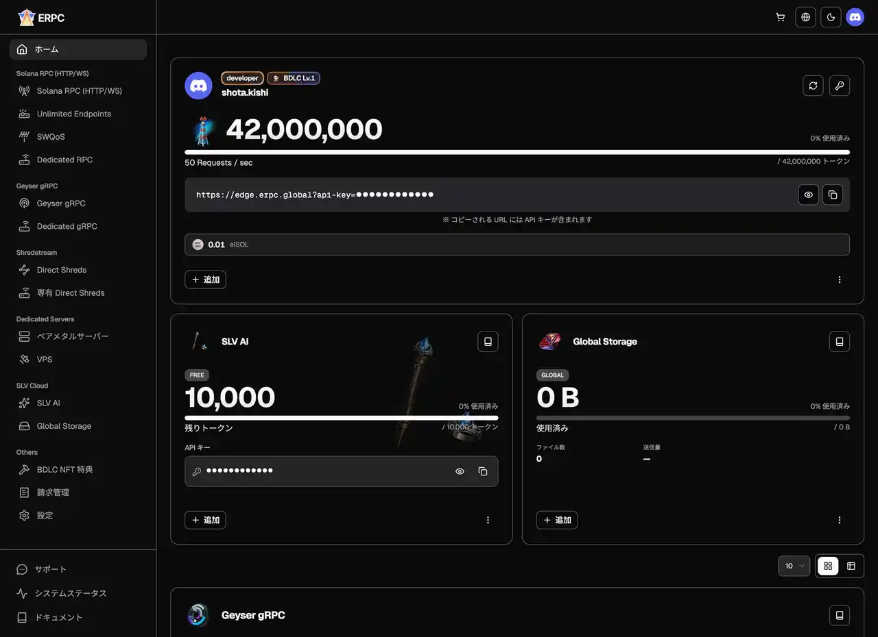 左サイドバーには、Solana RPC、Solana Geyser gRPC、Solana Shredstream、ベアメタルサーバー、ハイパフォーマンス VPS、SLV AI、ERPC Global Storage、BDLC NFT 特典などのカテゴリが配置されており、それぞれに直接アクセスできます。 |