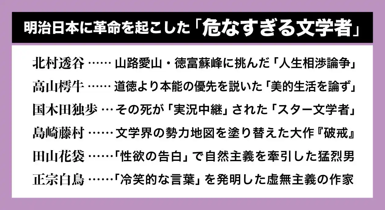 第1章 父と子の劇場――1893~1906年 1 明治日本の分断 2 不健全なる北村透谷 3 高山樗牛のニーチェ主義 4 藤村操の自殺と綱島梁川 第2章 不思議なる宇宙――1906年 1 厭世自殺の馬鹿青年 2 国木田独歩『独歩集』『運命』 3 島崎藤村『破戒』 第3章 野獣と悪魔――1907年 1 田山花袋「蒲団」 2 正宗白鳥と真山青果 3 評論の自然主義 第4章 文士の天下――1908年 1 発禁問題 2 博文館、『中央公論』、新潮社 3 偉人化する文学者 第5章 真摯に告白せよ――1909~10年 1 流行する告白小説 2 個人主義の促進剤 3 自然主義対政府 第6章 破壊の後で――1910年代 1 自然主義の円熟 2 古い悴と新しい悴 3 文化と共同体 |