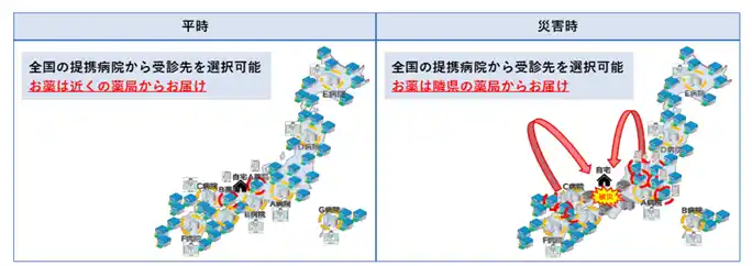 加えて、災害時や感染症流行時などの非常時においては、医療インフラが寸断された際に診療と投薬を止めないための「代替医療回線」として、場所に依存しない診療継続と処方薬の配送継続、生活継続を確保することが可能な平時のオンライン診療・処方薬配送を非常時に転用できる模倣困難な医療レジリエンス基盤です。 |