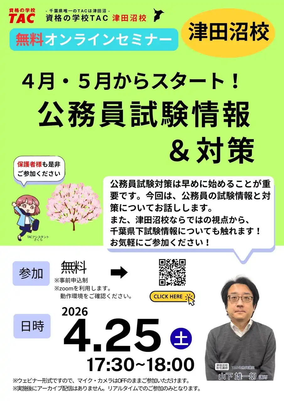 | TAC津田沼校独自の視点から千葉県下の試験情報にも触れるので、お気軽にご参加ください! | |||