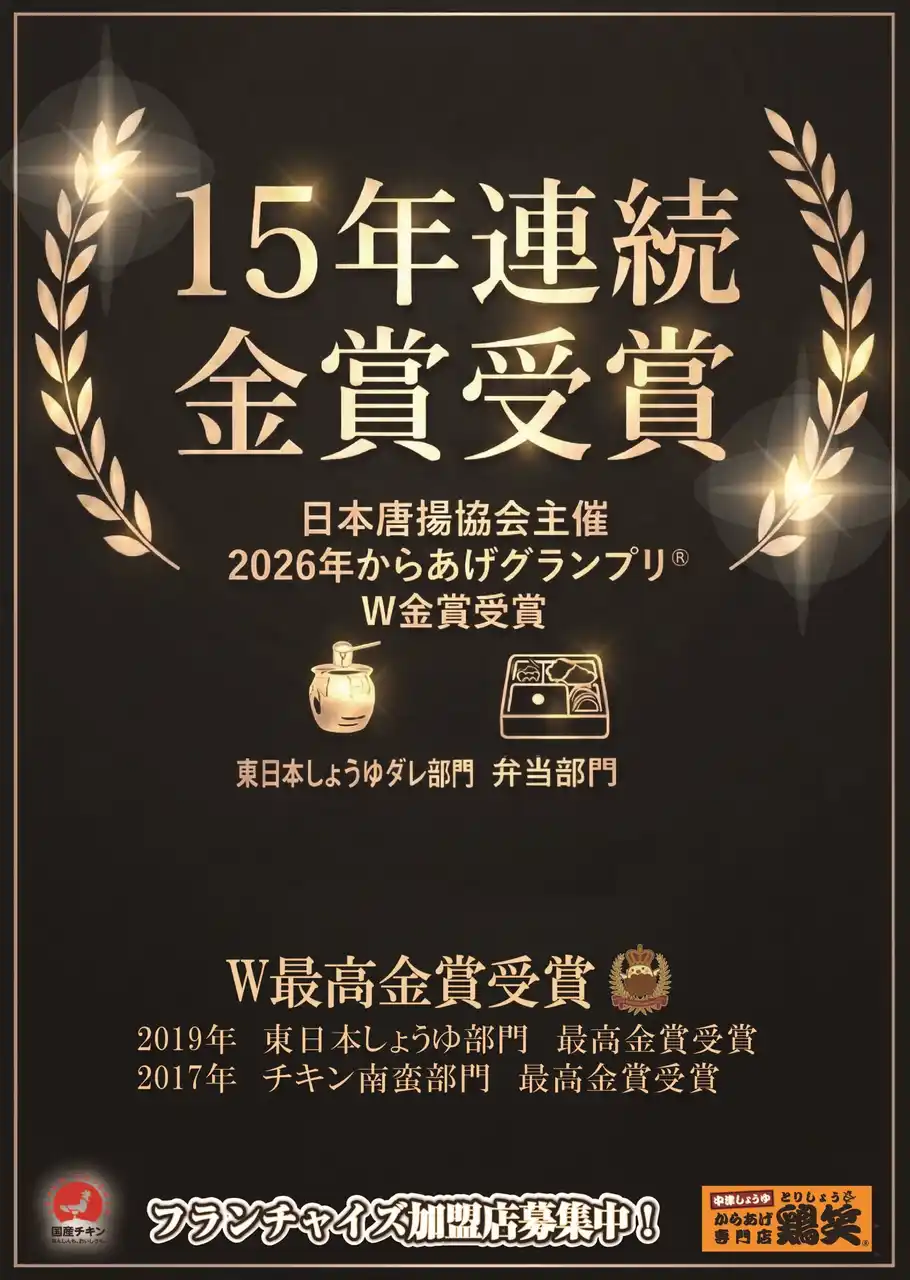 SRSグループの株式会社NIS(本社:大阪府大阪市、代表取締役執行役員社長 岡田連平)が運営する「からあげ専門店 鶏笑」は、一般社団法人日本唐揚協会が主催する「第17回からあげグランプリ」において、「東日本しょうゆダレ部門」および「弁当部門」にてW金賞を受賞いたしました。また、2017年の「チキン南蛮部門」最高金賞、2019年の「東日本しょうゆダレ部門」最高金賞の受賞を含め、鶏笑は15年連続で金賞を受賞しております。 |