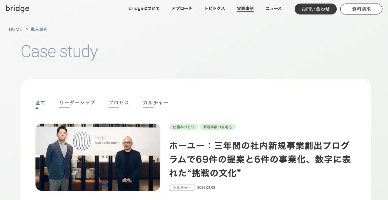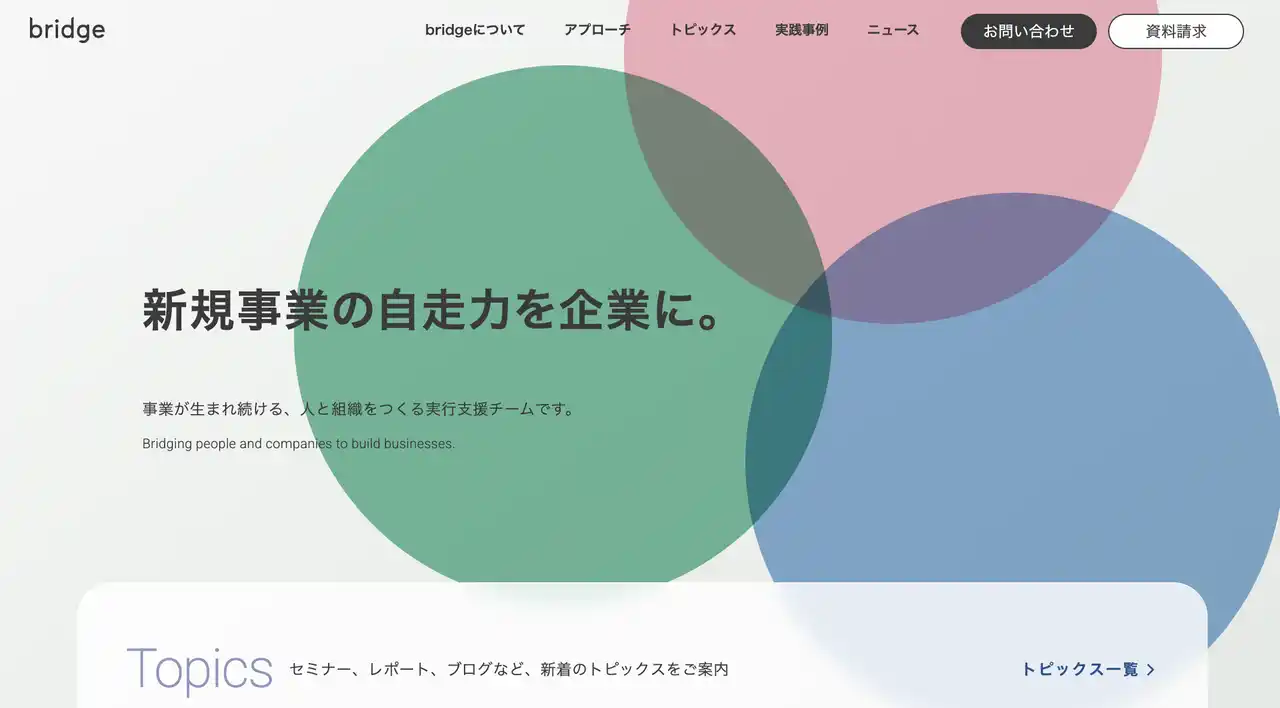 新規事業の自走化支援を行う株式会社bridge(本社:東京都港区、代表取締役:大長伸行、以下bridge)は、創業10期目を迎える節目に、企業情報・事業内容をより分かりやすくお届けすることを目的として、公式ホームページをリニューアルいたしました。 |