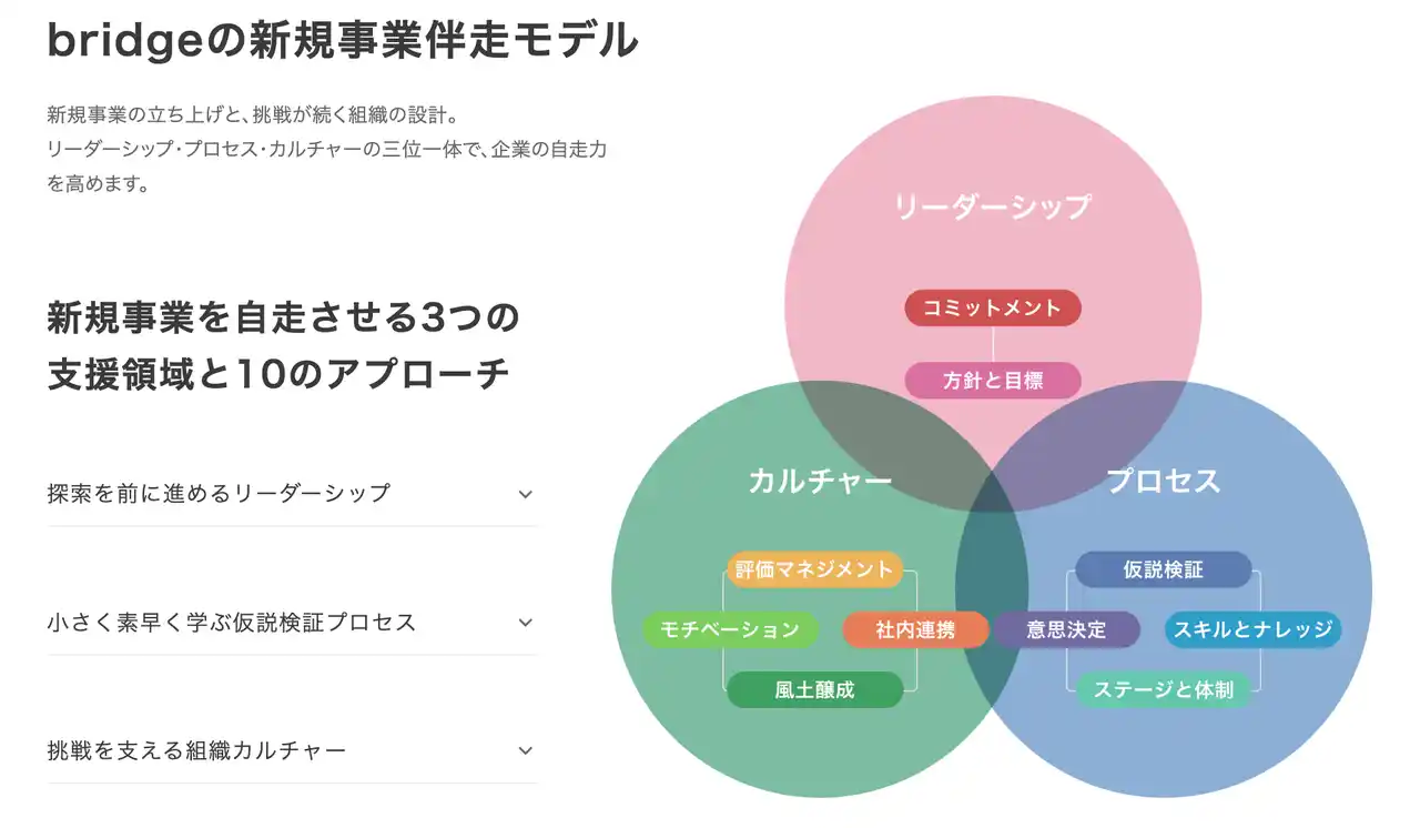 bridgeが新たに提唱している、「新規事業を自走させる3つの支援領域と10のアプローチ」について、具体的に伝えるページを作成しました。リーダーシップ・プロセス・カルチャーの三位一体で、企業の自走力を高めるメソッドと実践事例を紹介しています。 |
