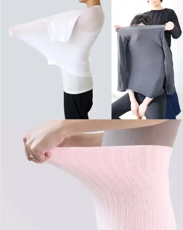 全方向に伸縮するオリジナル素材を使用。小さい力で大きく伸びて優しく身体にフィットし、身体を締め付けずに心と身体をあたためる、着る人、着せる人にも優しい商品です。 |