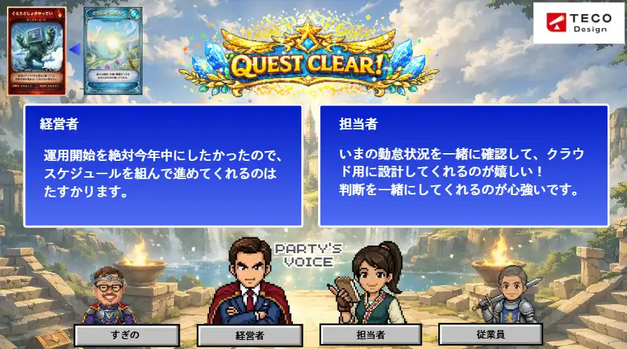 | 機能を並べるのではなく、現場で起きている課題を“敵”として捉え、各社の強みを“魔法”や“装備”のように見立てることで、人事労務担当者が自社に必要な選択肢を楽しく整理できる場をつくります。 | ||||||||||||||||||
