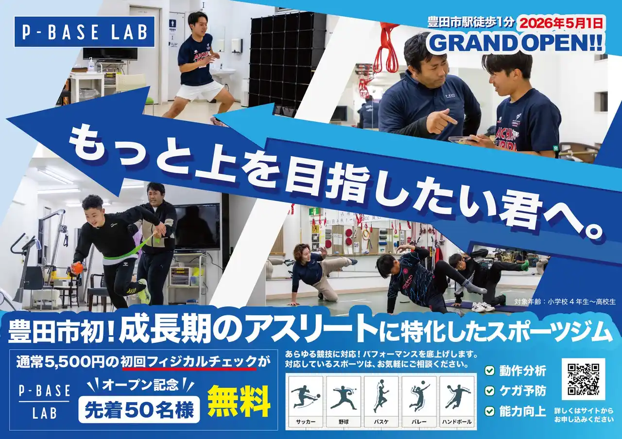 P-BASE LAB(コミュニティジム) 「歩き方を変え、身体を整える」をコンセプトに、理学療法士等の知見を活かしたパーソナルトレーニングやサーキット運動を提供。夕方からは小学生から高校生向けのジュニアアスリート教室も開校。 |