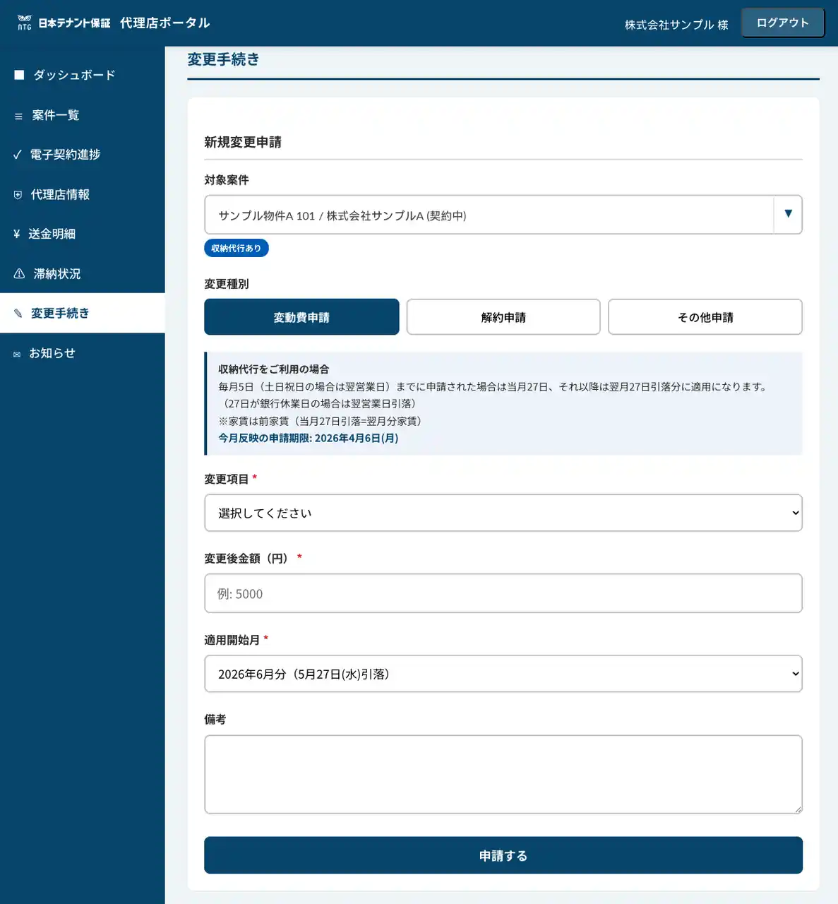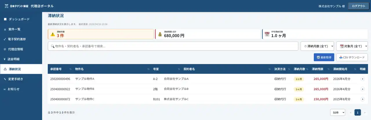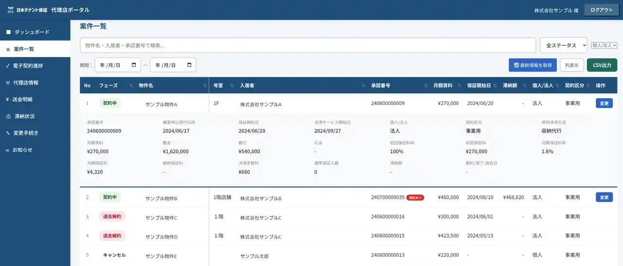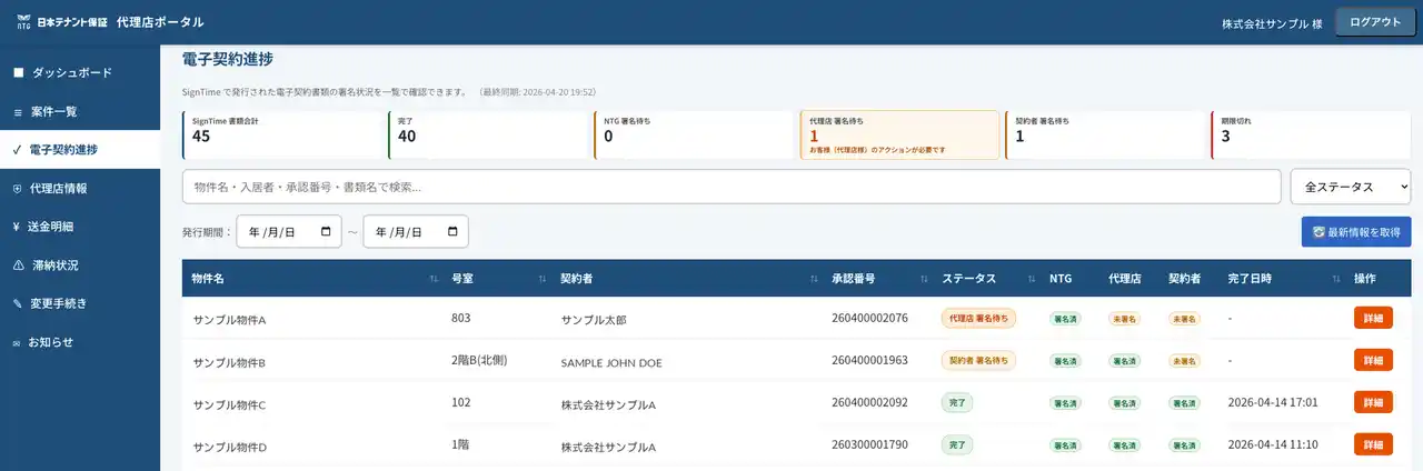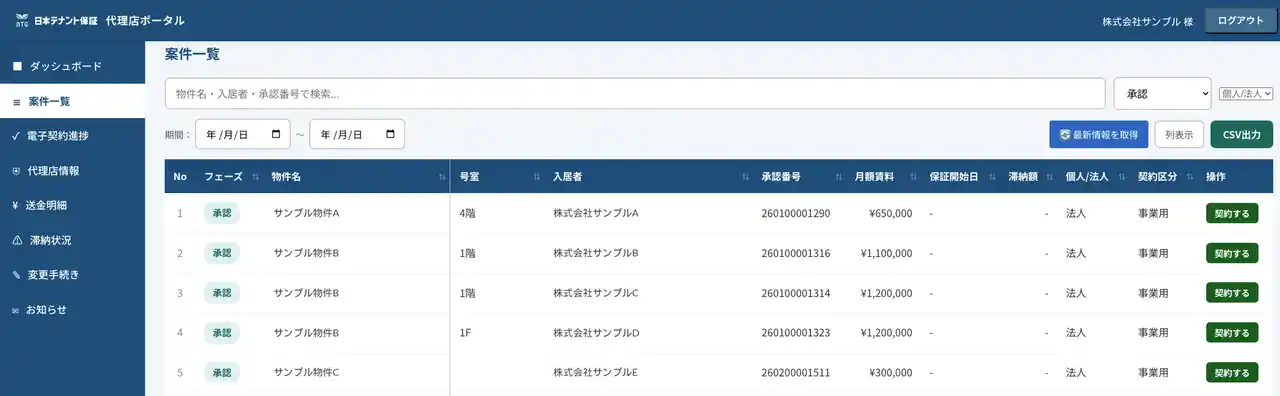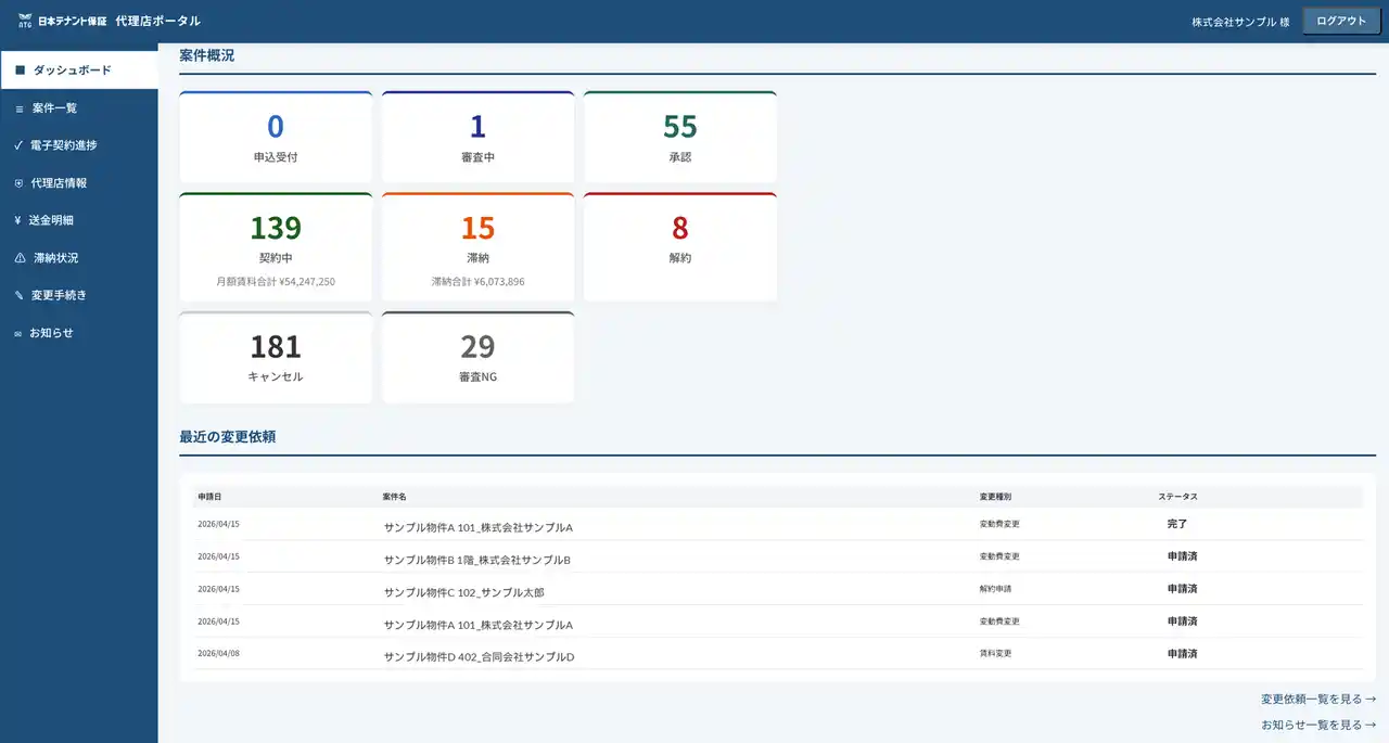 日本テナント保証株式会社(本社:東京都渋谷区、代表取締役社長:佐藤耕平、以下「当社」)は、当社と代理店契約を締結している不動産会社向けに、家賃債務保証案件をリアルタイムに可視化・管理できるWeb上の専用管理画面「日本テナント保証 代理店ポータル」を2026年4月より無償で提供開始したことをお知らせします。 |