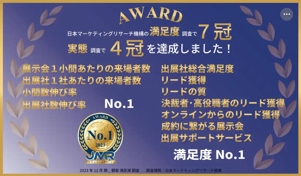 | 主催者である本委員会では、これまで国内最大級のDX総合展『DX 総合EXPO』をはじめ多くの展示会を開催しております。おかげ様でこの度、日本マーケティングリサーチ機構の満足度調査で7冠、実態調査で4冠を達成いたしました。 | ||||