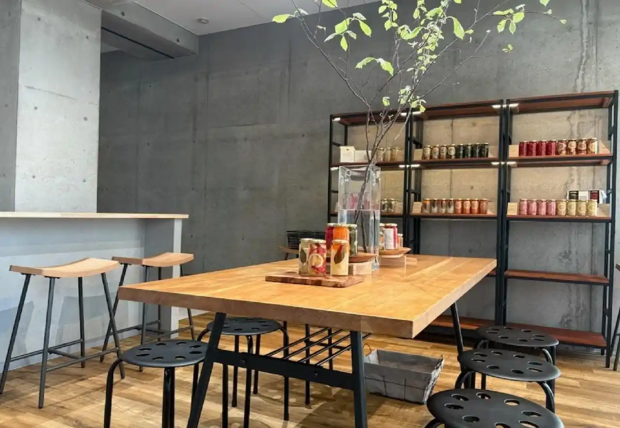 コンクリートの無機質な質感と、木目の温もりが心地よく調和した店内 |